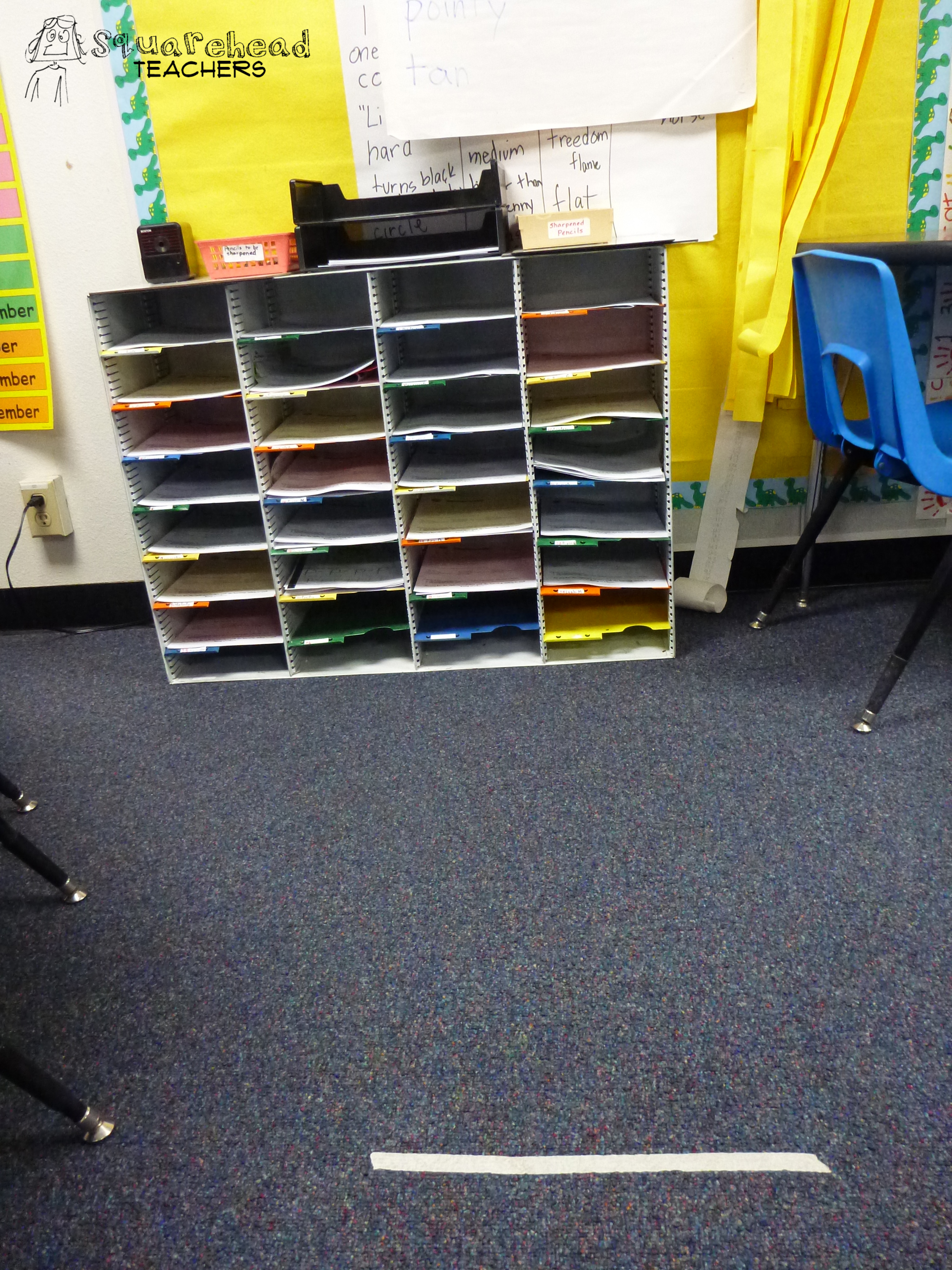 Here’s a genius idea that’s so simple I’m embarrassed that I didn’t think of it on my own. The teacher put a strip of masking tape a few feet away from the mailboxes to help her 2nd graders not crowd around the mailboxes at the end of the day. Her classroom rule is that only 2 students can be in front of the mailboxes at any one time (the rest have to form a line behind the line) and they can’t bring their backpacks to the mailboxes (they should be open on your desk before you go empty your mailbox). AWESOME idea!