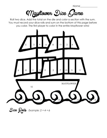 Print one of these pages for each player. Players roll two dice and have to color the sum on their Mayflower (as well as write the addition problem on their paper). First to color the entire thing wins! Simple and fun Thanksgiving game for practicing math (especially for lower grades)! Click here for the printable PDF: Mayflower Dice Game PDF
